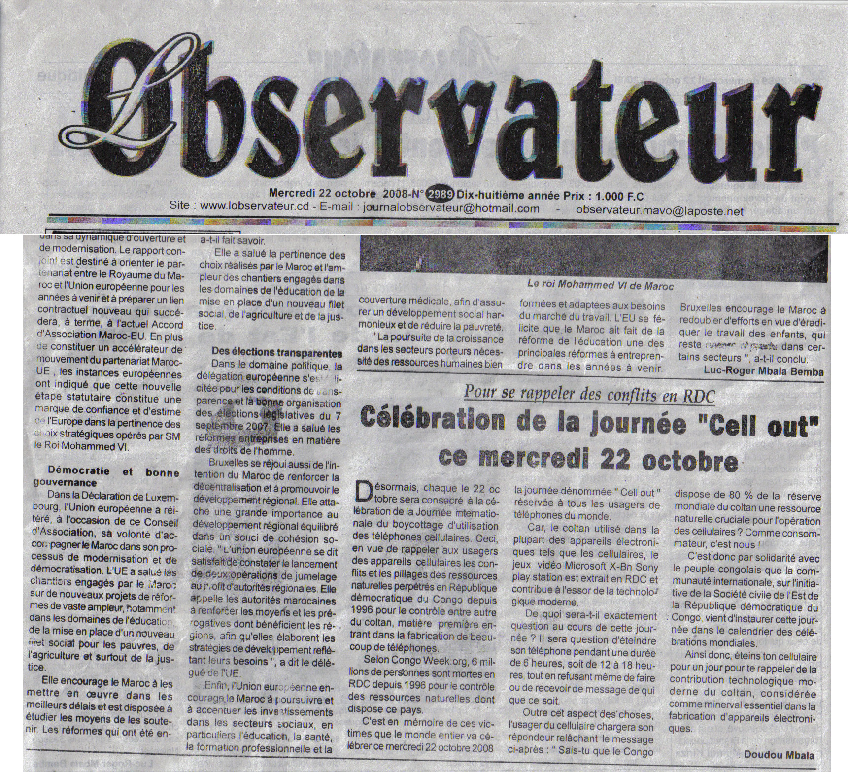 Since i joined this movement and tried to talk about it openly and widely, i felt discourage as i saw nobody paying attention to the cause, nobody interest in it here in Congo. But yesterday, i was surprised to read an article in "L'Observateur", a local newspaper, on the Cell Out Celebration. Certainly, it's a short article. But to me, it's a kind of breath of wind. I know now i'm not alone, there are people out there, feeling concern about this.